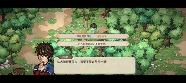 (1)前往 无名地区→迷踪林(上图地图标点位置),触发过场剧情,选择:“不能见死不救……”,触发战斗(需要打4只野猪)。