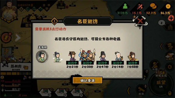 然后选几个还没挖专属文物的名臣带进来,先去有自己专属文物的城巡访,不知道位置的可以先在装备栏看一下,地图上刷新的名臣也可以招募进来当苦力。专属文物是4级城以上必出的,施行完要求的名臣政策后就开始挖掘了,这个过程必须在大地图等待。挖完之后可以再去其他有普通文物,并且有巡访次数的城市巡访。