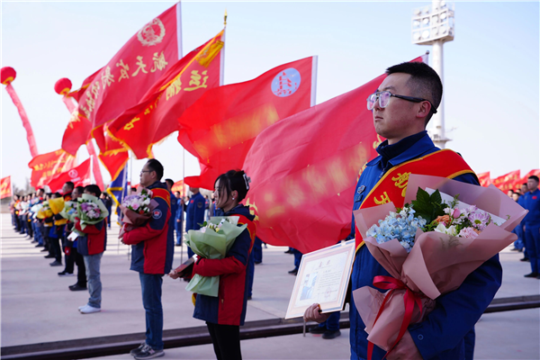大会现场,身着航天工作服的科技工作者排列整齐,精神抖擞,底气十足。