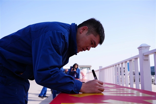 大会最后,印有“坚决夺取神舟二十一号载人飞行任务全面胜利”的巨型横幅展开,工作人员依次上前签字。