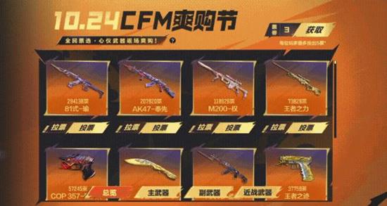 CFM爽购节全民票选活动在限时活动界面找到CFM爽购节即可参与,此次CFM爽购节投票上架了超多武器,不仅有热门的三国系列武器,还有很多王者系列武器返场。每位玩家最多投出5票:在活动期间任意一天进入活动,即可在右上角领取3张票券,每个账号仅限领取1次;除此之外每日分享活动即可获得1张票券,每日限领1次,累计限领2次;这样就是5次投票机会啦!