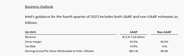 同时Intel还公布了对2025年第四季度的业绩指引:营收在128亿到138亿美元之间,毛利率为34.5%,按非公认会计准则计算为36.5%。