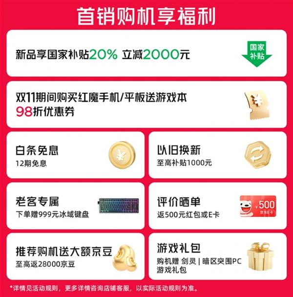 首销期间用户于京东平台下单还可享受新品专属权益,包括12期白条免息、以旧换新至高补贴1000元、98折优惠券、红魔老用户下单赠价值999元冰域键盘、评价晒单返500元红包/京东E卡、大额京豆、多款热门游戏礼包等福利。