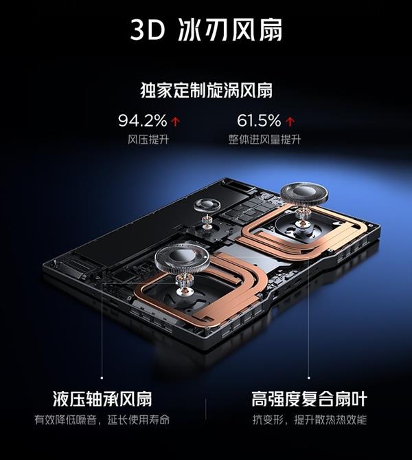 此外全新的3D冰刃风扇采用了2+1风扇布局,在独家定制旋涡风扇与高强度复合扇叶的组合加持下,整体风量提升了61.5%,风压提升了94.2%,能快速将散热鳍片上的热量排出机身,避免热量堆积。