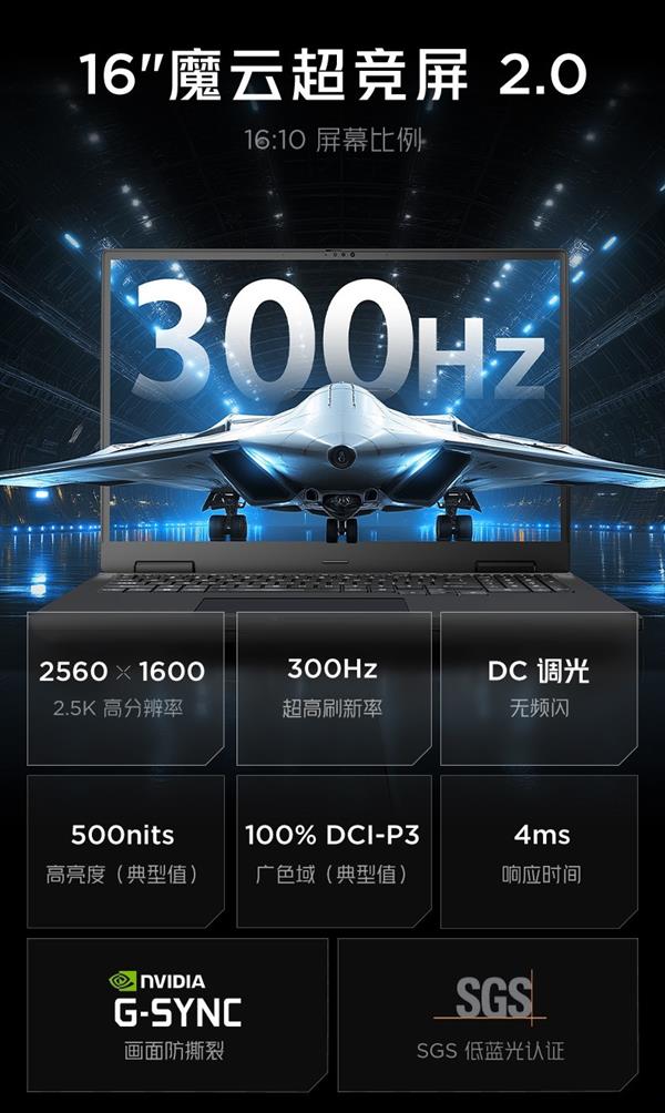 屏幕方面,红魔游戏本16 Pro·2026搭载2.5K分辨率的魔云超竞屏2.0,支持300Hz超高刷新率,响应时间为4ms,最高亮度500 尼特,支持DC调光并通过了SGS低蓝光认证,流畅更护眼。