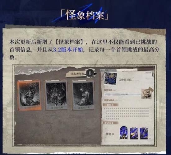 本次更新后新增了「怪象档案」,在这里不仅能看到已挑战的首领信息,并且从3.2版本开始,记录每一个首领挑战的最高分数。