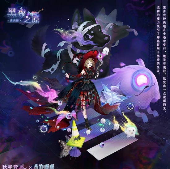 【黑夜之原】含全新妆容“位面失序”,特效连衣裙“黑夜之原”,动态摆件“奇灵幻妖”、“一目鬼怪”、“绮想黯影”,可移动摆件“异世行路”,特效魔杖“本真指引”,精美纹身“星辉遗痕”。