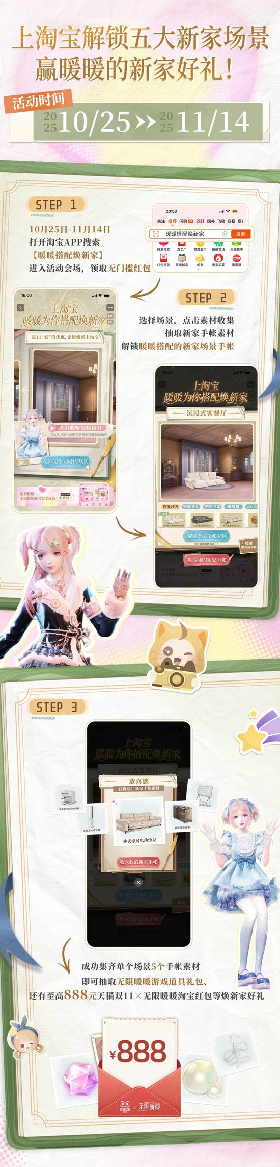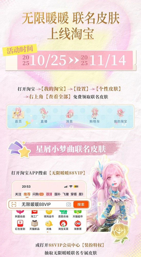 *即日起上淘宝APP搜索「暖暖搭配焕新家」,解锁暖暖搭配的新家场景,即有机会免费获得游戏道具礼包、主题皮肤、888元红包等;上淘宝APP搜索「无限暖暖88VIP」,88VIP用户更有淘宝专属限定皮肤、联名周边色纸等焕新家好礼。