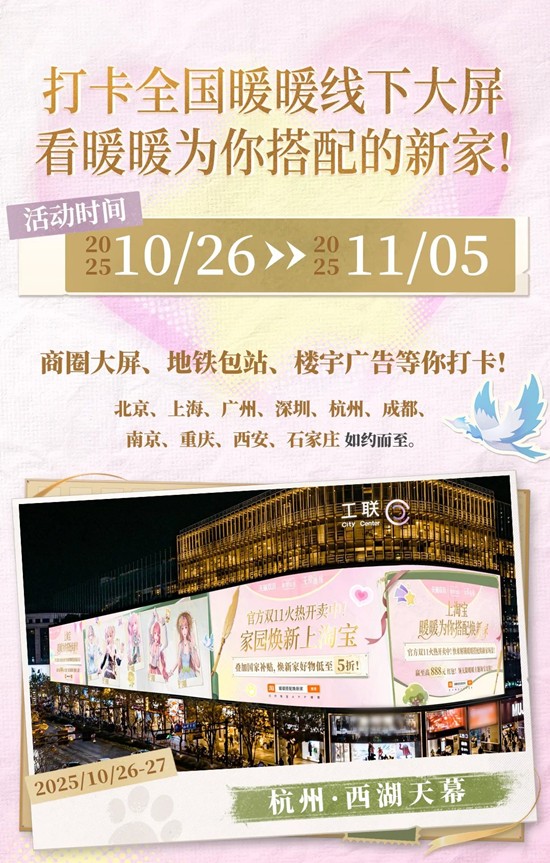 *10月26日~11月5日,暖暖将在多地线下大屏与大家见面!杭州火车东站&西湖天幕、广州正佳广场、上海徐家汇TPY等如约而至!