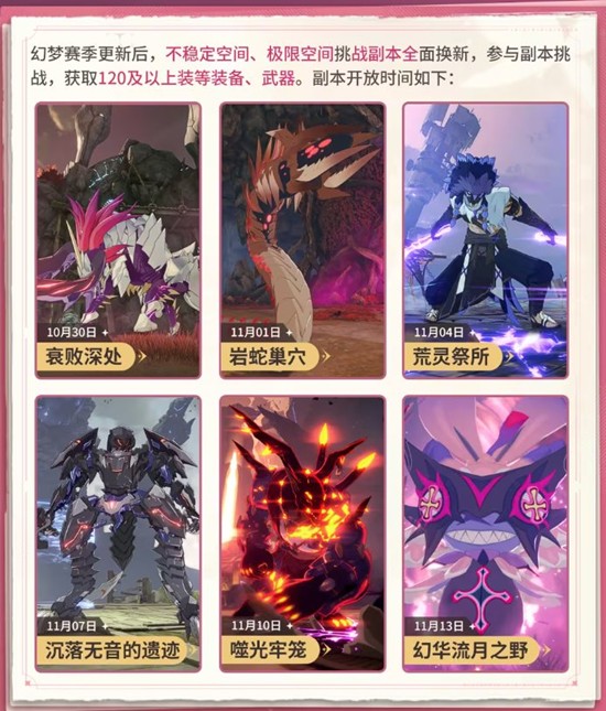 副本更新:幻梦赛季更新后,不稳定空间、极限空间挑战副本全面换新,参与副本挑战,获取120及以上装备、武器。