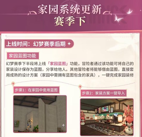 赛季下:家园蓝图功能上线,冒险者通过该功能可将自己的家装设计保存为蓝图,分享给他人。