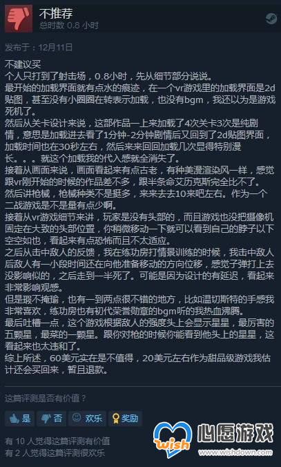 时间:2020-12-12 | 作者: | 阅读:50由重生娱乐开发、EA发行的VR游戏《荣誉勋章:超越巅峰》已于昨日登陆Steam平台,游戏国区售价298元,不支持中文。本作的首日评价很糟,目前评价为“多半差评”,有293位玩家对该作进行了评测,好评率仅36%。大部分玩家表示游戏的手感还可以,但是价格太贵了,而且承诺的繁体中文版并没有上线,画面也不太好。