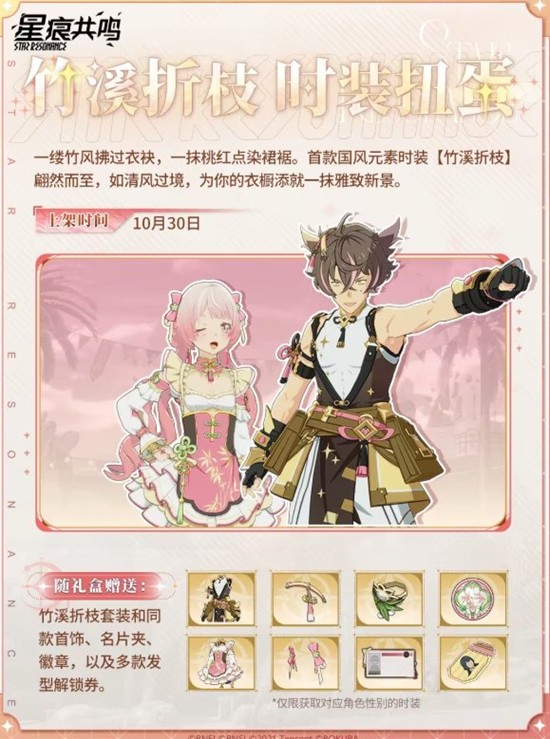 竹溪折枝时装扭蛋以国风元素为设计灵感,为玩家们带来了一款清雅别致的新装。一缕竹风拂过衣袂,一抹桃红点染裙裾,这款时装不仅在设计上融入了传统美学,更通过男女装的差异化设计,分别展现了柔清丽与干练的气质。