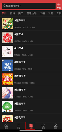3、专题页面:都是带有主题的内容,用户发布作品的时候可以根据主题分类;