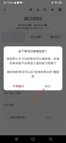 2、在背单词界面,点击上方的“砍”,在弹出窗口中点击“确定”,这样就能成功将该单词砍掉了。
