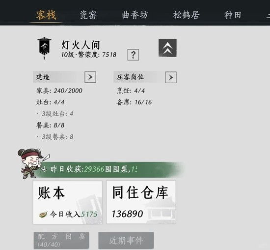 那么每周(8级家业)固定获得囤囤粟,单人情况:点石瓯3万(2到6万不定)+少东家一天1.2万+不羡仙收入2.2万*7=3+1.2+2.2*7=19.6万。那么每周卖老金材料不能超过27-19.6=7.4万。否则客栈收入溢出为0
