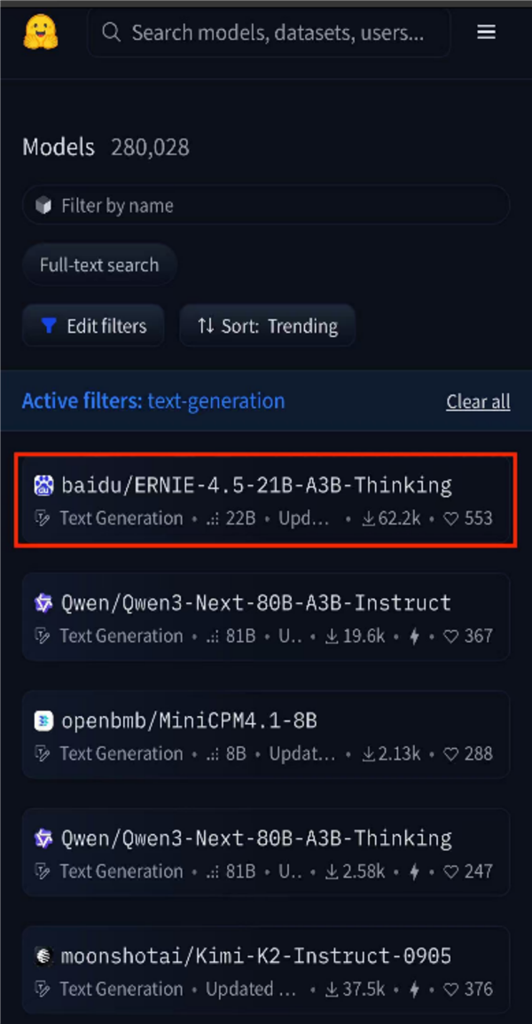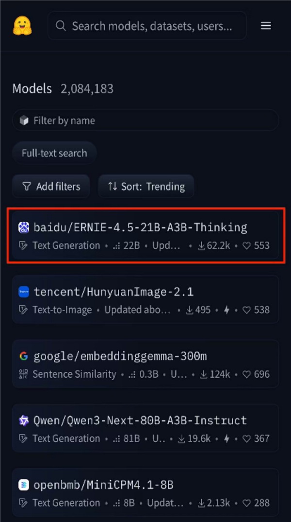 与此同时,百度的开源模型多次登顶国际模型排行榜。截至2025年9月12日,百度最新开源的文心思考模型ERNIE-4.5-21B-A3B-Thinking在HugginFace全球模型总趋势榜和文本模型趋势榜均排名第一。10月16日,百度最新开源模型PaddleOCR-VL发布后16小时内登顶HugginFace Trending,连续5天稳居榜首。
