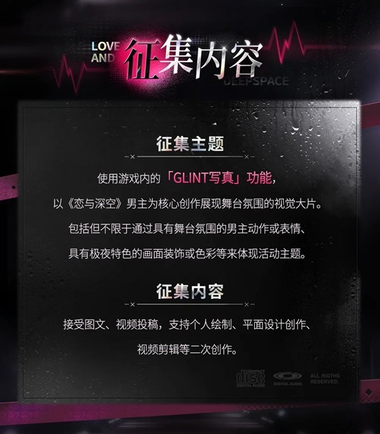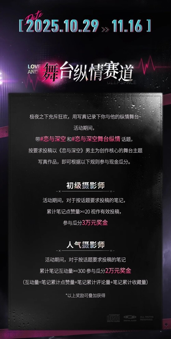 赛道二:带#恋与深空 和#恋与深空舞台纵情 双Tag,以《恋与深空》男主为核心,按要求创作并发布舞台主题相关的写真作品,有机会参与多层现金瓜分!