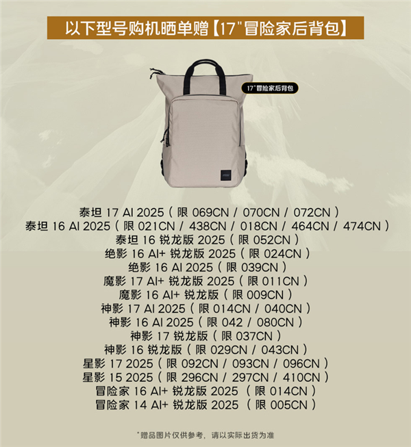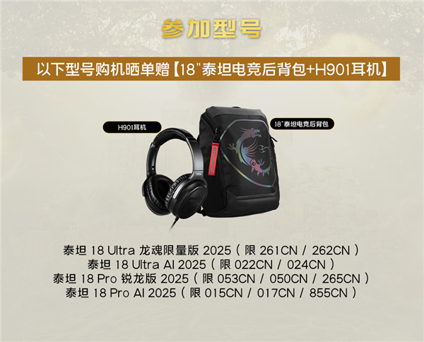特别值得关注的是,微星为双11准备了丰厚的晒单好礼。活动期间购买指定型号微星游戏本的玩家,只需完成晒单即可参与买赠好礼,购买不同机型,晒单赢的好礼不同,其中包括18英寸泰坦电竞后背包+H901耳机组合、18英寸泰坦电竞后背包单品和17英寸冒险家后背包单品等,让您在享受高性能设备的同时,更有机会赢取额外惊喜。