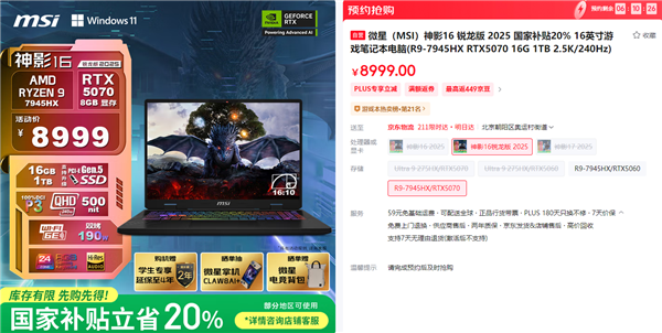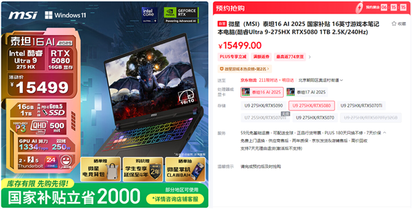 特别值得关注的是,部分地区享受"国补"优惠政策,购买微星电竞本最高可节省20%的购机费用。即使不在国补覆盖区域的消费者,也能享受平台提供的多种优惠券和补贴活动,整体优惠力度依然可观。