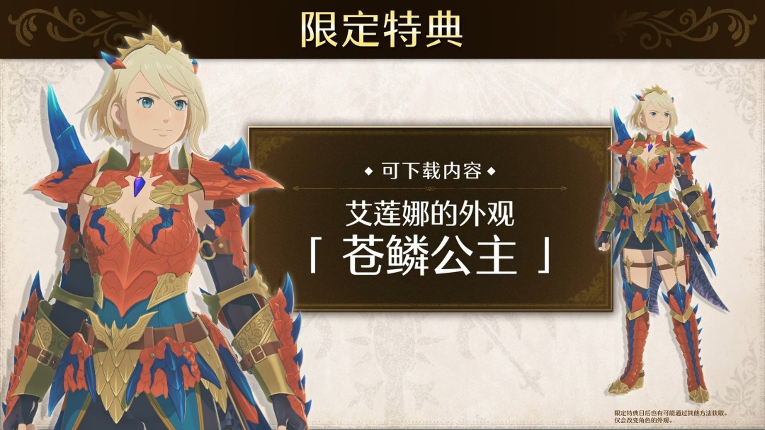 包含游戏本体。预购即可获得限定特典——主角艾莲娜的专属服装“苍鳞公主”。这款服装的设计灵感源自苍鳞火龙装备,让艾莲娜以全新姿态踏上旅途。