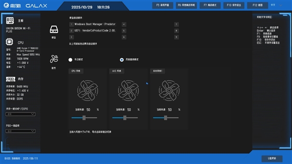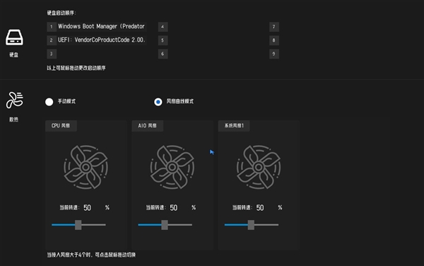 BIOS首页中间,还有硬盘启动顺序调整和风扇性能调整,大家可随意按照自己的需求选择风扇手动模式或风扇曲线模式(即PWM)。