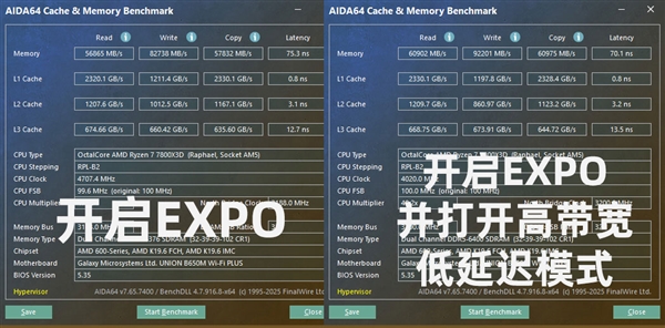 同时,如果CPU与内存允许的话,非常建议尝试打开内存的高带宽低延迟模式。在相同CPU、主板加持下,该模式打开后性能提升效益非常大,不仅是内存读写、延迟也有了显著提升。