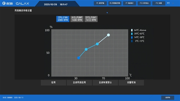 如果想要更细致地调整风扇曲线,按下F6进入风扇高级调整页面即可,大家可根据自己的实际需求进行曲线调整。