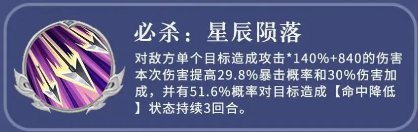 其实暴击对于夏侯渊这类武将来说是非常重要的效果,他有暴击的话,那么造成的伤害数值是非常高的,他的技能上面有个必杀技,叫做星辰陨落,这个技能可以对一个敌方单体的目标造成攻击,攻击的数值是140%的基础数值加上840的伤害,并且本次伤害还可以提高一定的暴击概率,这里的暴击概率提升数值是可以可以达到29%左右的,此时还有30%左右的伤害加成,并且必杀技最大的一个效果,就是有大概一半的概率可以对目标造成命中降低这样的影响,这个影响是可以持续3个回合来混乱掉敌人的攻击。