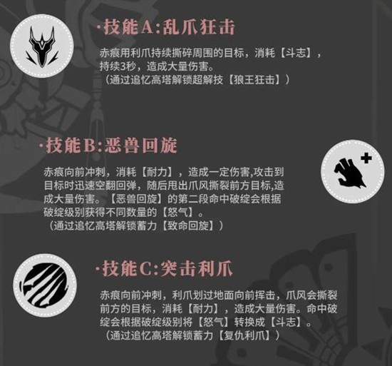 在解锁追忆高塔相关进度后,辉烬的乱爪狂击将进化为狼王狂击。新形态下技能需消耗斗志,持续三秒内对周围敌人进行高频撕裂攻击,范围伤害显著提升。同时,恶兽回旋新增致命回旋变式,突刺利爪也升级为复仇利爪,每次技能强化都让辉烬的近战压制力更进一步,形成层层递进的战斗节奏。