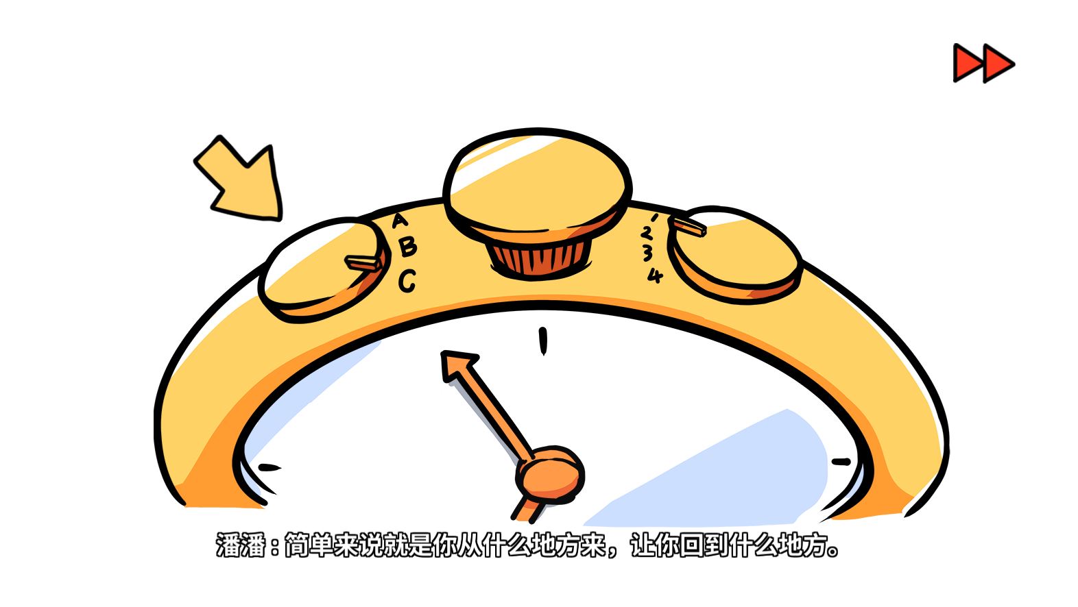 在修理好时间控制器后,潘潘为我们详细介绍了时间控制器的用法。左边的三个档位用于设定穿越方法,ABC三档分别代指人穿(整个人穿越不同时空,可以遇见对应时空的自己,不止穿越时间,还会穿越平行宇宙),魂穿(意识穿越,将自己的意识覆盖在对应时间点的自己身上,只穿越时间),返程(返回到使用时间控制器之前的时空)。右边的4个档位用于控制在进行过多次穿越后返程时穿越的时空,由于可以随意切换,且穿越后会恢复所有状态,所以并不需要担心选错。