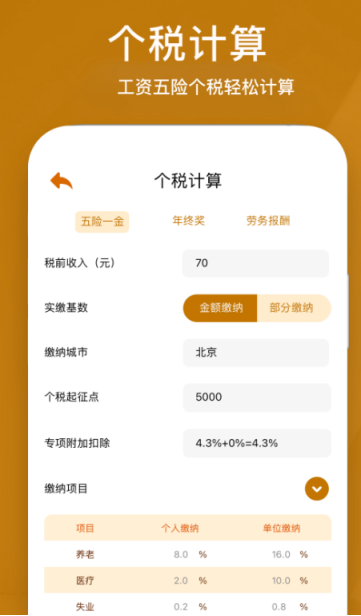 这是一款多功能财务辅助工具,主打个税计算功能,适用于需要精确核算工资薪金所得的职场人士。除了基本的个税测算外,还集成了房贷月供计算和常用单位换算功能,方便用户在购房规划或日常工作中使用。数据输入简单,结果展示清晰,能快速反馈应纳税额和实发工资,实用性较强。