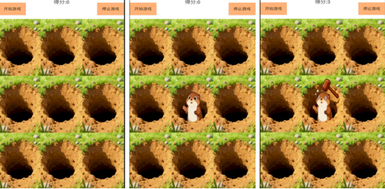 屏幕的土地中会呈现出9个洞穴,而其中的地鼠,会随机从不同的洞穴中钻出,你要眼疾手快,用手指直接点击锤子去打地鼠,每次击中地鼠后,即可获得相应的分数,刚开始地鼠出现的频率,可能比较低,会让你有反应的机会和时间,但是随着关卡的升级之后,地鼠就会快速钻出。