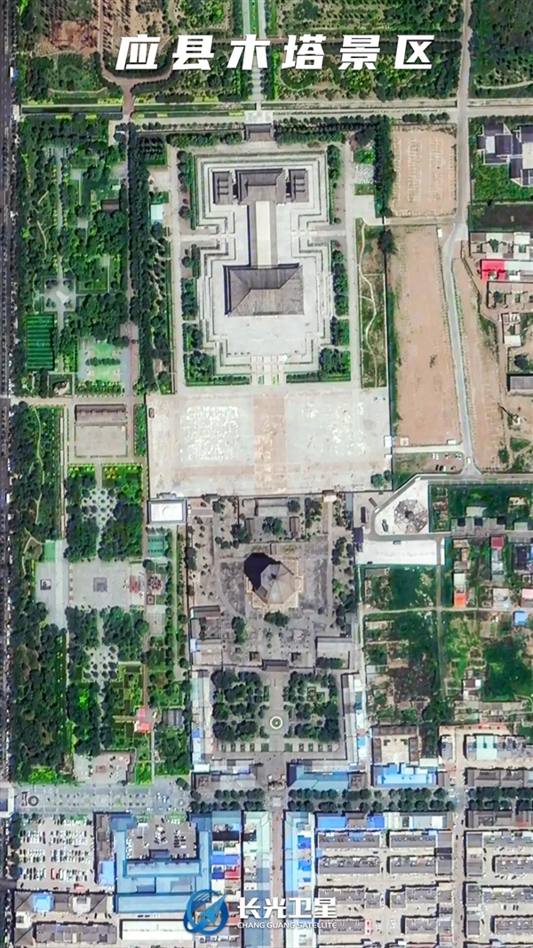 在吉林一号拍摄的卫星图中,最引人注目的当属世界最高木塔——山西应县木塔。