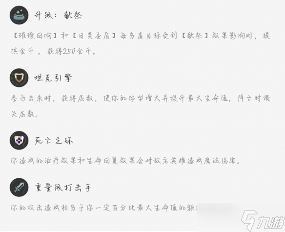 升级献祭:璀璨回响和日炎圣盾每当有目标受到献祭了效果影响时,提供金币。获得250金币。