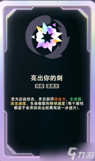 亮出你的剑:变为近战状态,并获得攻击力、生命值、攻击速度、生命偷取和移动速度。