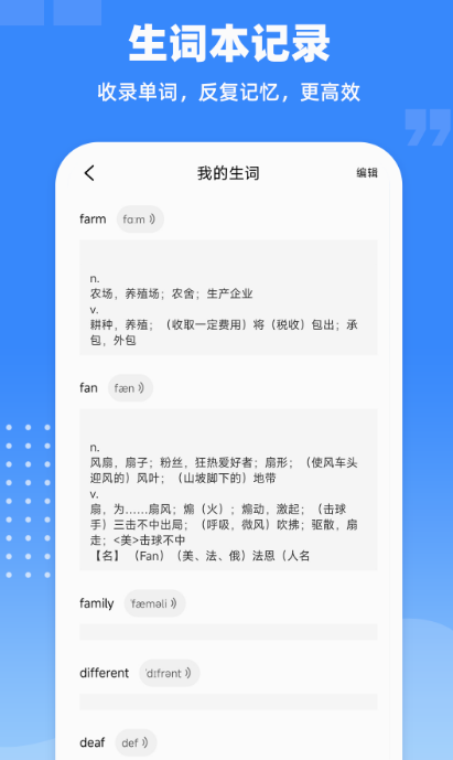 这是一款专为英语学习者设计的记忆工具,界面简洁,操作便捷,适合各类用户上手使用。应用内无广告干扰,运行稳定安全,提供大量词库资源,覆盖日常用语、考试词汇等多个场景。通过听音辨义、生词解析等模块,帮助用户多维度巩固记忆。同时支持设置密码进入专属学习空间,可与朋友在线互动交流,打造个性化的英语学习环境。