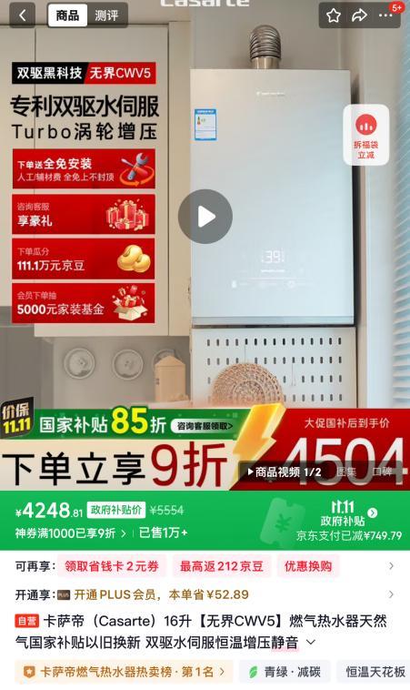卡萨帝无界CWV5燃气热水器,AI定制恒温水,温度始终刚刚好,创新瀑布洗科技,搭载Turbo涡轮增压技术,水量翻倍,独嵌两用不设限,从容适配多种家居布局,一级静音认证守护安心睡眠,七重母婴净水洗科技,深度阻垢抑菌。京东11.11下单享9折和国家补贴85折,到手价4248元,还享全免安装服务。