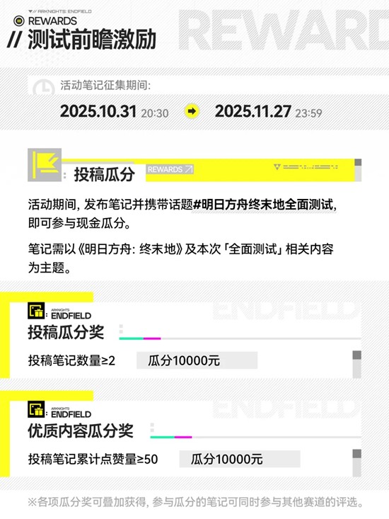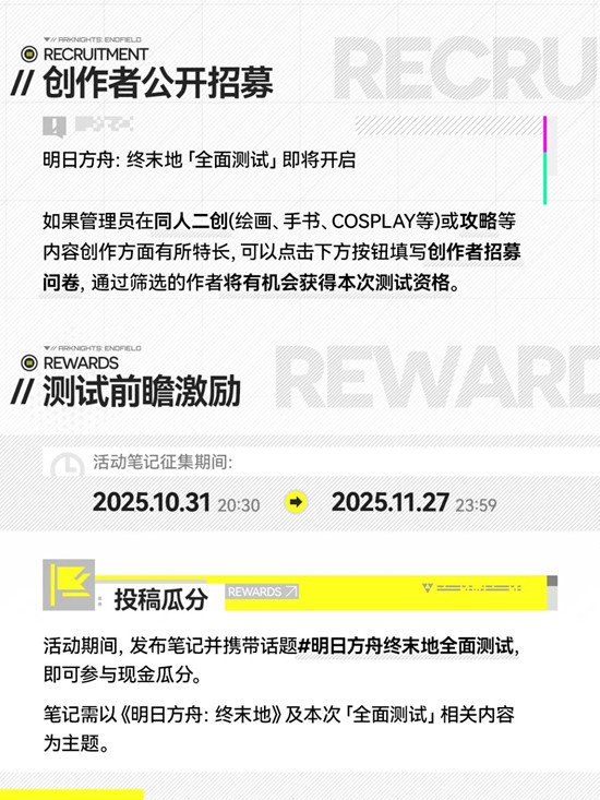 ◇ 测试前瞻激励:活动期间,发布笔记并携带话题#明日方舟终末地全面测试 ,即可参与创作激励赛道,参与瓜分和优秀笔记评选。
