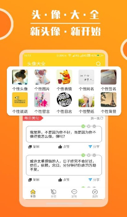这是一款集多种图像处理功能于一体的头像设计类工具。平台内置丰富的内容分类体系,涵盖人物、卡通、动物以及情侣主题等多种风格资源。在寻找情侣头像时,用户可直接进入对应专区进行浏览与筛选。该软件持续更新头像素材库,确保内容紧跟潮流趋势,满足不同用户的审美需求,让你和另一半总能找到契合心意的配对头像。
