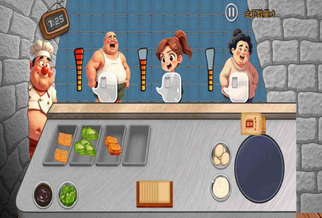 这款游戏为大家设计了一个妙趣横生的世界,你将会成为一个店铺的老板,而你的客人们说的都是流里流气的方言,定能让你的听感震撼,博得你的笑容。游戏里的客人如现实的一般,耐心极为有限,所需要的煎饼口味也不尽相同,而你要快速做好正确的煎饼,这个过程可以磨练你的手速和记忆能力。