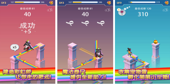 五颜六色的彩虹桥将是你前进道路中的重要元素,开局后就会看到两个平台之间是没有任何桥梁进行连接,因此你要通过建设彩虹桥的方式,精准的移动到下个平台中,移动的距离越远,获得的分数就会越高,其中还有神奇的魔法卷尺,帮助您测量两个平台之间的距离,无论彩虹桥过短或者是过长,都会导致游戏失败。