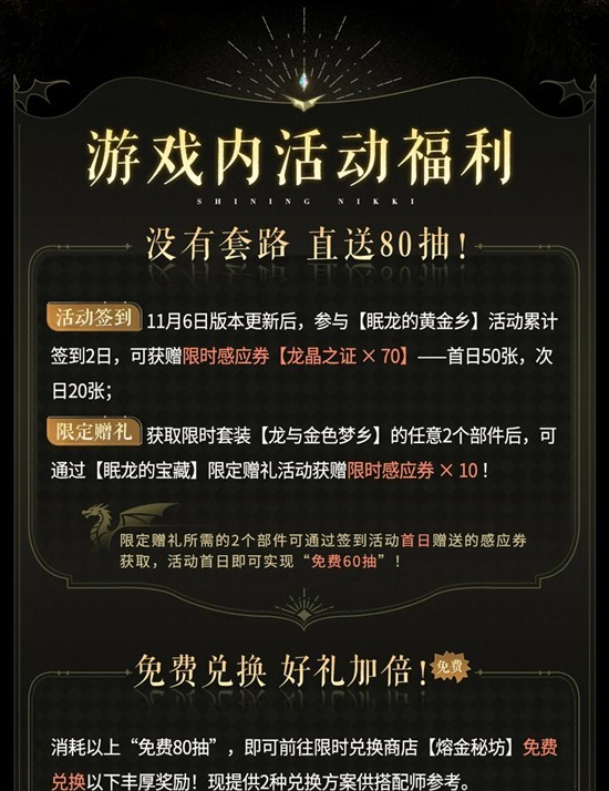 11月6日更新后,参与版本活动即可免费获取【限时感应券×80、300+粉钻、1套稀有服饰】等丰富奖励。阿花整理了一份【版本福利速递】,助你轻松掌握福利内容!