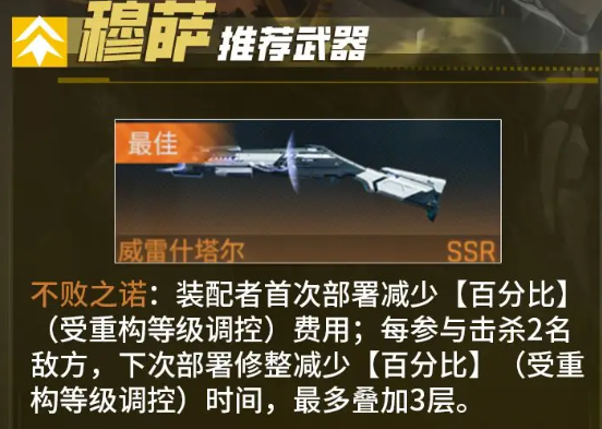武器的选择没有什么好犹豫的,直接挑选威雷什塔尔,这把武器的被动效果简直就是量身打造,在装备之后第1次部署就可以减少费用。具体减少多少百分比是根据武器重构等级而调整,一开始部署的压力就可以小一大截。比较实用的是每参与击杀两个敌人,那下一次部署休整的时间也会减少,最高可以叠加三层。用上这把武器,那角色的强度和手感都可以更上一层楼。