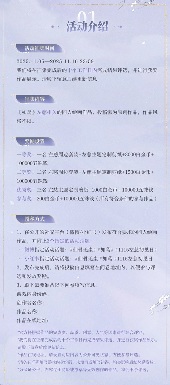 · 参与奖:200白金币+100000五铢钱(所有符合条件的参与作品)