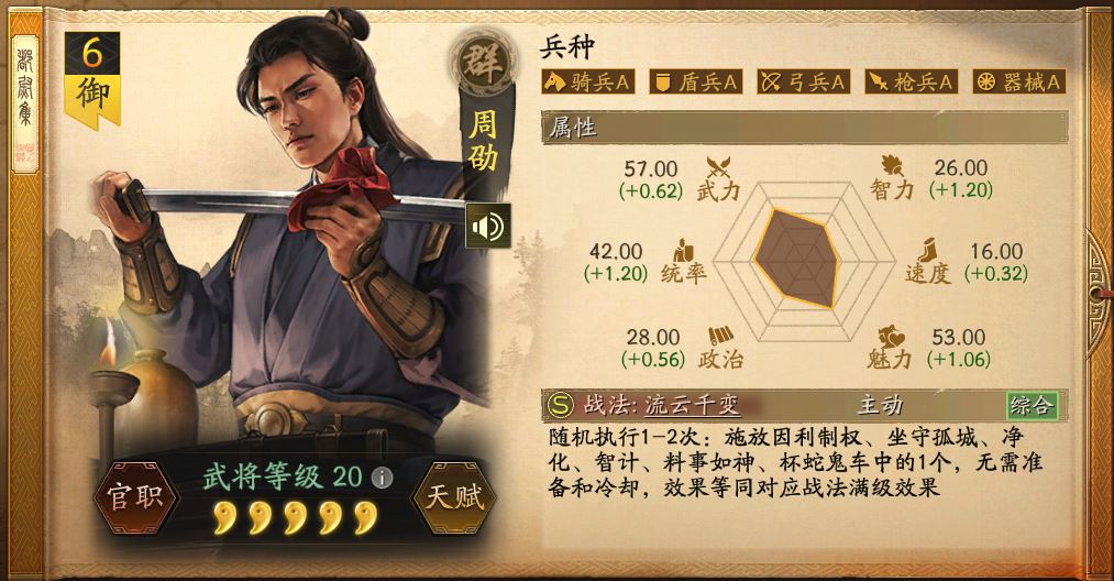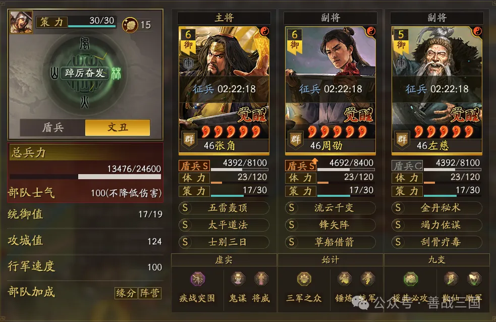 关于开荒:使用《姜夏诸开荒》再转型或是开荒难度大的《貂蝉张角左慈开荒》再转都尉,打地是张角的硬伤,40级前打7地感觉战损大的话,可以试试给张角带太平+临机(6级)都尉带陷阵营,过了40级后就会好起来。