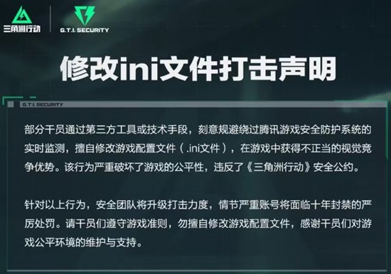 部分干员通过第三方工具或技术手段,刻意规避绕过腾讯游戏安全防护系统的实时监测,擅自修改游戏配置文件(.ini文件),在游戏中获得不正当的视觉竟争优势。该行为严重破坏了游戏的公平性,违反了《三角洲行动》安全公约。