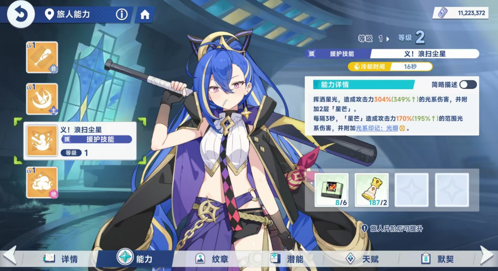 援助技是密涅瓦的核心,密涅瓦在释放它时能对敌人直接造成伤害,还可对敌人施加星芒效果,每三秒就会有一层星芒爆掉,触发时不光能再次对敌人造成伤害,敌人也会因星芒爆开的关系而被施加上光系印记,令主控角色能更频繁地通过打爆印记来打出额外的伤害。其绝招则是能持续性地造成范围光系伤害,每次攻击间隔为0.3秒,共持续5秒,总伤害量特别的高,在敌人较多的场合中能有效地通过绝招来实现快速清屏,而在单体敌人的作战环境下,绝招的伤害也能为队伍补足不少的输出。