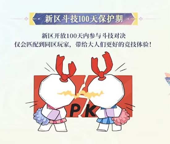 新区开放100天内参与斗技对决,仅会匹配到同区玩家,为玩家提供更好的竞技体验,保护新手玩家的成长空间。