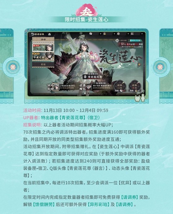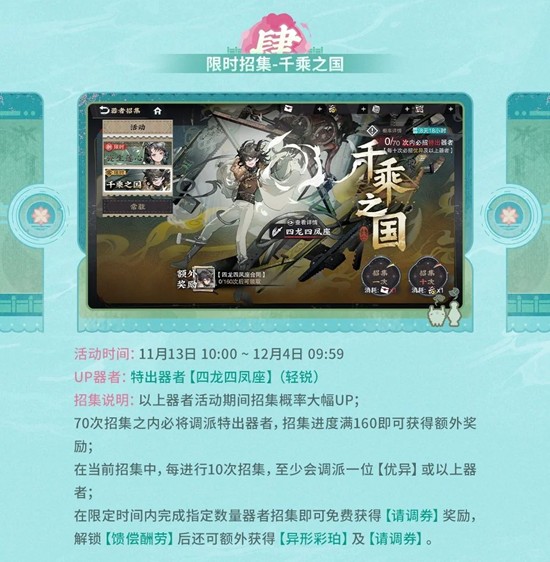 招集说明:以上器者活动期间招集概率大幅UP;70次招集之内必将调派特出器者,招集进度满160即可获得额外奖励,并且同期开放的同类型招集额外奖励进度互通